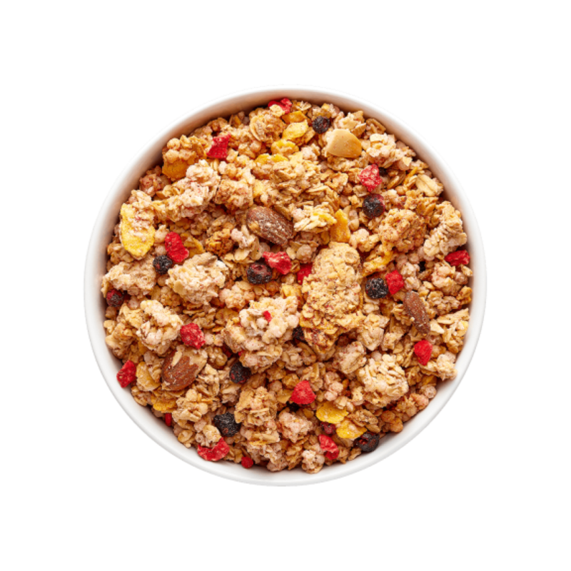 Des céréales croustillantes avec de délicats fruits rouges (fraises, framboises, myrtilles)