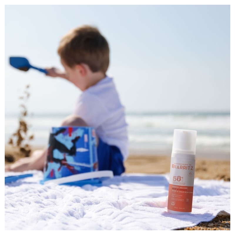 La crème solaire bébé & enfant SPF50+ assure une protection optimale.