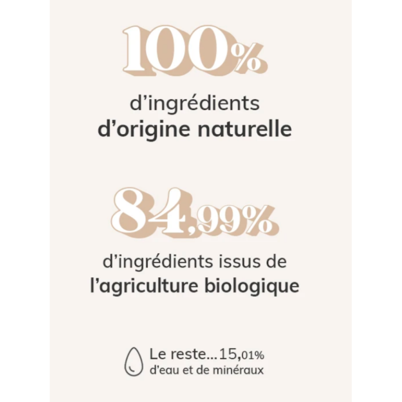 Chaque ingrédient apporte un réel bénéfice à votre peau. La fabrication par saponification à froid nous permet d’obtenir un savon avec 6 % de surgras, composé uniquement d’ingrédients naturels certifiés bio et à la texture crémeuse et nourrissante.