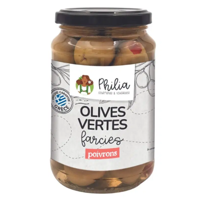 Ingrédients: olives vertes dénoyautées* origine Grèce, eau, lanières de poivron rouge*, sel marin, régulateur d'acidité: acide citrique.