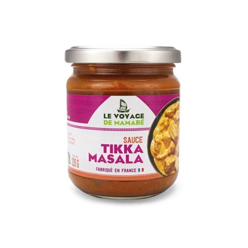 Ingrédients: tomate*, lait de coco*, oignon*, huile de noix de coco*, ail*, épices tikka masala poudre*, sel*, gingembre*, aromates*, jus de citron*.
